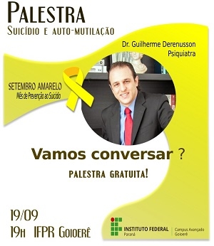 3) O IFPR de Goioerê vai promover a palestra "Suicídio e auto-mutilação", com o psiquiatra Guilherme Derenusson. Será dia 19 (19h), no câmpus. A participação é aberta à comunidade e é gratuita.