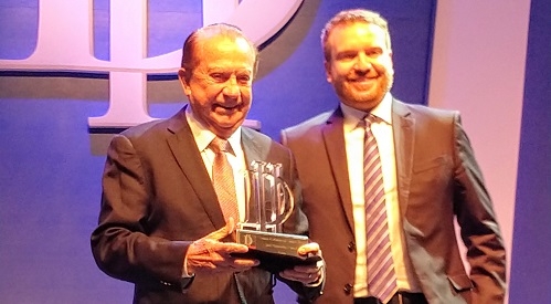 O presidente José Aroldo Gallassini recebeu o troféu do diretor de Núcleo da Editora Três, Carlos Santana.