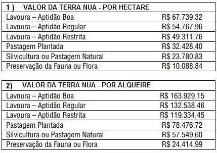 "Para levantamento dos dados utilizou-se a tabela do Deral/Seab, transações, ofertas e opiniões do mercado imobiliário rural, acrescido de correção inflacionária e valorização da terra agrícola, em conformidade com as nuances de cada aptidão agrícola correspondente ao solo na região do Município de Campo Mourão".