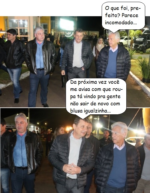 Os cliques são do último sábado, em Goioerê. Os deputados Douglas Fabrício (estadual) e Rubens Bueno (federal) estiveram na Expogoio, com direito a uma passeadinha com o prefeito Pedro Coelho. Os três são do PPS, mas só Bueno e Coelho usaram jaquetas idênticas.