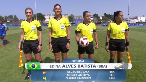 A foto é de segunda-feira, em Saint Malo, na França, uma das sedes da Copa do Mundo sub-20 Feminina. A China venceu o Haiti por 2 a 1, em partida que teve Edna Alves (com bola na mão) como árbitra. Ela é de Goioerê, onde, inclusive, preside a Liga de Futebol Amador. O Brasil disputa essa Copa. Perdeu para o México na estreia (3 a 2) e nesta quarta enfrenta a Inglaterra (deu 1 a 1).