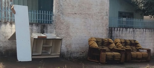 Rua João B. Perdoncini, no jardim Albuquerque. Outro dia desses foi publicada foto de balcão deixado na calçada. A peça continua lá. Agora, do outro lado da rua, apareceu armário, pedaço de armário e dois sofás de um lugar cada. Um verdadeiro feirão a céu aberto.