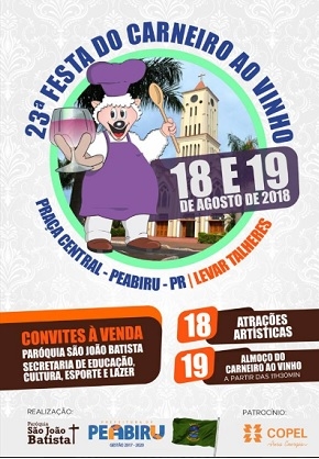 Já comprou o convite para a 23ª Festa do Carneiro ao Vinho? Pois fique sabendo que eles estão à venda na paróquia São João Batista e na Secretaria de Educação. O prato típico de Peabiru será servido no próximo dia 19. Foram colocados dois mil convites à venda. Custa R$ 40 ou R$ 20 para criança sde 7 a 12 anos.