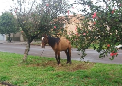"Indo ao trabalho encontro cavalos amarrados no canteiro central. Lugar inadequado para eles, sem água, sem comida. Na rua paralela à av. Ney Braga, próximo ao Ilha Bella".