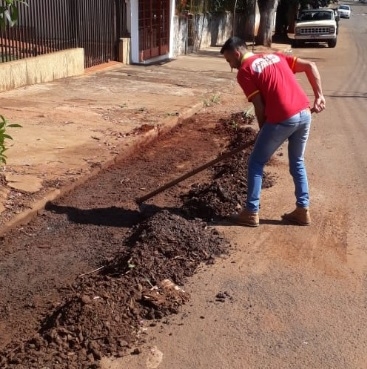 Moradores da rua Joaquim Correia Gonçalves, em Iretama, cansados de esperar prefeitura, tomam um atitude e limpam o meio fio e os bueiros. Rua no centro da cidade, próximo à escola municipal Maria de Lourdes.