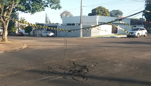 "Fios soltos caindo do poste e populares colocaram fita de sinalização, foi sábado, na av. Irmãos Pereira, próximo ao ginásio JK".