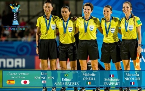 O Japão é o campeão da Copa do Mundo sub-20 feminino, encerrada nesta sexta-feira, na França. Venceu a Espanha na final por 3 a 1. A gente não teria nada a ver com isso se a árbitra Edna Alves, de Goioerê, não tivesse atuado na decisão (na foto, a segunda, da esq. para a dir.). Foi a quarta árbitra do jogo. No final, como manda a tradição, teve direito a medalha da Fifa.