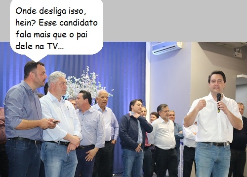 O clic é desta sexta-feira, no Celebra, onde teve "comício" do candidato a governador Ratinho Jr (PSD). Dez prefeitos da região participaram. Um deles é Leandro da Farmácia (Araruna), que parece estar apontando um controle para o candidato, como se quisesse desligá-lo. Ou vá ver era pra aumentar o volume...