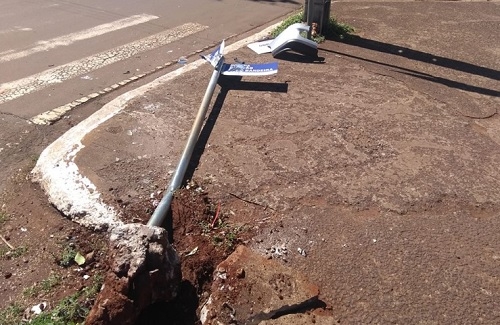 Cena de domingo. Placa caída e pedaço de carro na av. Capitão Índio Bandeira, esquina com rua Santa Catarina. centro de Campo Mourão.