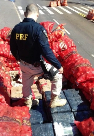 A Polícia Rodoviária Federal de Ubiratã apreendeu no sábado um caminhão com 2.167 quilos de maconha. Detalhe: os 2,5 mil tabletes da droga estavam escondidos no meio de uma carga de cebola. O motorita, de 28 anos, é de Foz do Iguaçu e disse que levaria a maconha para São Paulo.