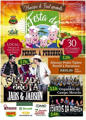 Defiinida a programação artística da Festa do Pernil à Pururuca, que Farol realiza dia 30 de setembro. A atração prinicipal será a dupla Jads & Jadson, a partir das 17h. Antes tem a Orquestra de Viola de Campo Mourão (11h) e Cowboys da América (14h). O convite paro o prato típico custa R$ 50.