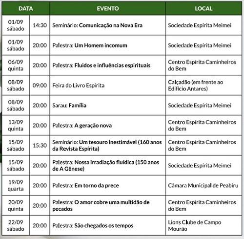 Você sabia que as duas casas espíritas de Campo Mourão fazem aniversário em setembro? São 53 anos do Centro Espírita Caminheiros do Bem e 34 anos da Sociedade Espírita Meimei. Para comemorar elas se unem e realizam a 11.o Mês Espírita. A programação inclui seminários, palestras e feira do livro. Começa já neste sábado. Tudo com entrada franca. Confira acima.
