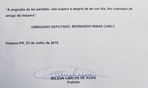 "Deputado estadual Bernardo Ribas Carli, amigo, parceiro de inúmeras conquistas para nosso município de Iretama. Deus o receba na sua infinita bondade, pois: A mais bonita lágrima é a da saudades, pois ela nasce dos risos que já foram, dos sonhos que não acabam e das lembranças que jamais se apagam".