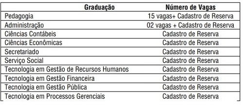 São 15 vagas para pedagogia e duas para administração, além de cadastro de reserva para outros oito cursos.
