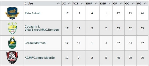 Campo Mourão está em quarto lugar (26 pontos), enquanto São José é 11º (15).