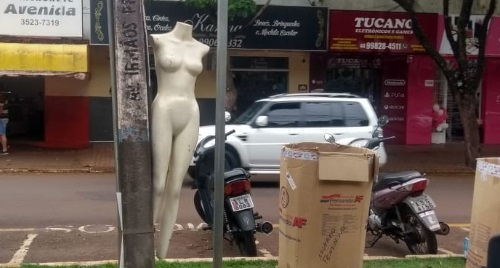 Quando você acha que já viu de tudo pelos canteiros centrais de Campo Mourão, olha o que aparece na av. Irmãos Pereira, esquina com rua Harrison José Borges. Um manequim de vitrine. Nu.