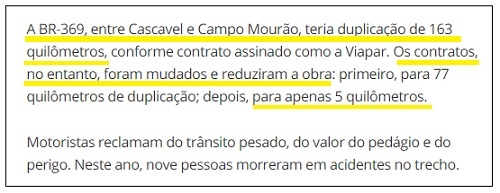 Apesar das praças de pedágio, a duplicação entre Campo Mourão e Cascavel (BR-369) não será feita, não.