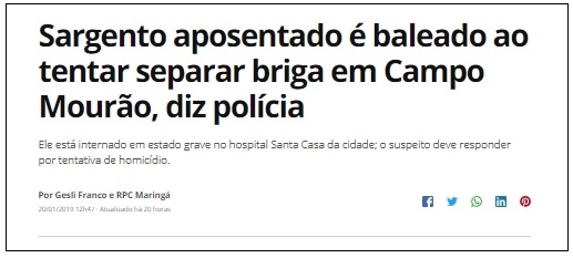 No momento em que se discute a posse (e o porte) de armas no País, notícia de Campo Mourão chama a atenção. Policial militar aposentado de Campo Mourão é baleado ao tentar separar uma briga no jardim Izabel. Detalhe: a arma era dele e foi tomada pelo autor dos disparos.