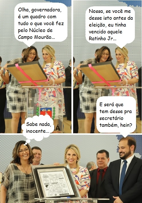 Os cliques são desta segunda-feira. A chefe do Núcleo Regional de Educação de Campo Mourão, Juliana Sena, aproveitou a liberação de recursos para escolas para presentar a governadora Cida Borghetti. Deu um quadro mostrando os "feitos de Cida" para o NRE. O secretário de Estado Rodrigo Salvadori (Planejamento) acompanhou de perto.
