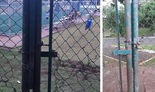 "Fotos do Parque do Lago. Já tem três dias que esse portão não abre.Como fazemos para jogar bola?"