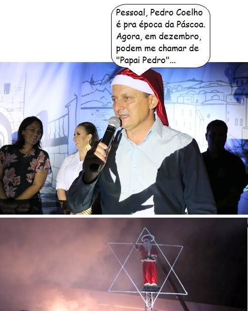 O clic é de sábado, em Goioerê, e quem discursa com o gorro do Papai Noel é o prefeito Pedro Coelho. Teve "Auto de Natal - O Renascimento" e chegada do Papai Noel. O "bom velhinho" chegou de carona na Estrela de Belém.