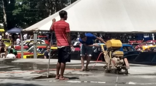 Praças centrais de Campo Mourão superlotadas na manhã deste domingo. Pudera. Ao mesmo tempo aconteciam a feira da economia criativa e o encontro de carros antigos. Mas eis que surgiu um "terceiro evento": a conclusão do piso da área do palco da praça. A máquina fez um barulhão danado e espalhou poeira pra todo lado.