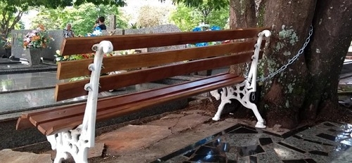 Se não colocar corrente com cadeado, levam até o banco. Isso dentro do Cemitério Municipal de Campo Mourão. O banco foi preso a uma árvore.