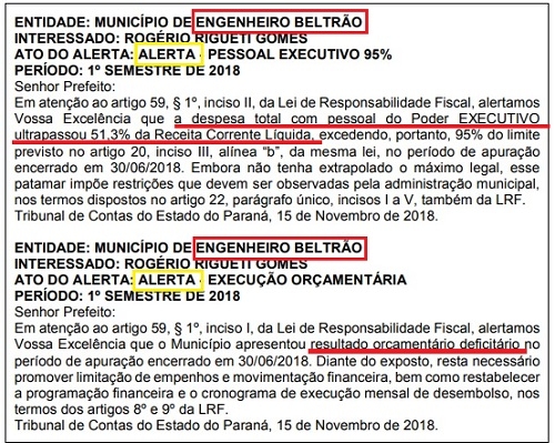 ...A prefeitura de Engenheiro Beltrão recebeu dois de uma vez só. Ambos publicados nesta terça-feira pelo Tribunal de Contas do Estado e endereçados ao prefeito Rogério Rigueti. Um alerta foi pelo excesso de gasto com pessoal no encerramento o primeiro semestre. O outro pelo resultado orçamentário deficitário no mesmo período.