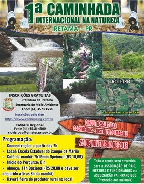 Chegou a vez de Iretama realizar sua primeira Caminhada Internacional na Natureza. O circuito Salto das Cachoeiras - Distrito de Malu terá 10 km entre trilhas e estradas rurais. A inscrição é gratuita. Para que quiser, tem café da manhã (R$ 10) e almoço (R$ 20). Em dezembro acontecem mais duas caminhadas na região - Goioerê (dia 2) e Janiópolis (9).