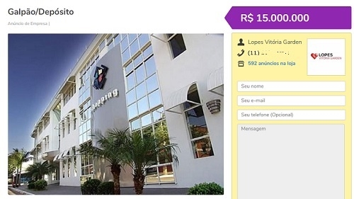 Anúncio de venda do antigo shopping Piu Bello está publicado no site OLX. Preço? R$ 15 milhões. Há quatro anos outro anúncio pedia R$ 25 milhões. O imóvel aparece com o título "Galpão/depósito" e frisa que é "muito bem localizado no centro de Campo Mourão".