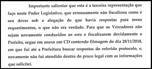 Neste terceiro pedido, Willian Gomes incluiu um DVD com a filmagem para comprovar que foi a prefeitura em busca da resposta que não foi dada. Isso porque nas duas outras denúnicas dele, a Câmara alegou que as respostas tinham sido dadas, o que Gomes contesta.