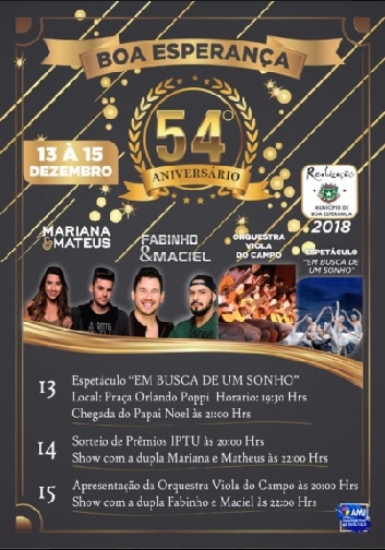 Definida a programação de aniversário de Boa Esperança, que completará 54 anos na próxima sexta-feira. Começa quinta-feira (19h30) com espetáculo de chegada do Papai Noel. Na sexta tem sorteio dos prêmios do IPTU (20h) e show com Mariana & Mateus (22h). No sábado tem a Orquestra Viola do Campo (20h) e Fabinho & Maciel (22h). Tudo em praça pública, sem cobrança de entrada.