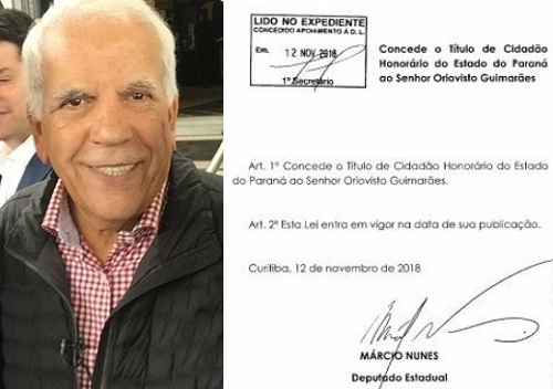 O senador eleito Oriovisto Guimarães vai receber o titulo de Cidadão Honorário do Paraná.