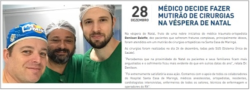 O destaque desta sexta-feira no site da Santa Casa de Maringá é um mutirão de cirurgias feito na véspera de Natal. Dez pacientes que sofreram fraturas complexas, principalmente idosos, foram atendidos no hospital no dia 24. Todos pelo SUS. Detalhe: a iniciativa partiu do médico Denilson Daleffe. O sobrenome não deixa dúvidas: é filho de Dilmar Daleffe, que por mais de 20 anos presidiu a Santa Casa de Campo Mourão.
