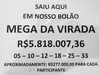 O bolão premiado em Campo Mourão foi o primeiro feito pela lotérica Índio Bandeira, em 5 de novembro. Ou seja, quase dois meses antes do sorteio. O prêmio total foi de R$ 302,5 milhões. Como 52 apostas em todo o País acertaram os seis números, cada uma leva R$ 5,8 milhões, que, divididos por 21 cotas do bolão, dá cerca de R$ 277 mil por apostador.