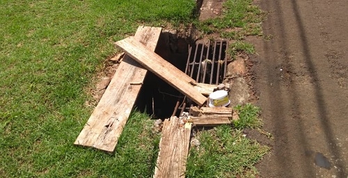"Situação que se encontra bueiro na rua Alcides Ferreira de Andrade, em frente ao número 201, no jardim Maria Barleta, no grande Lar Paraná".