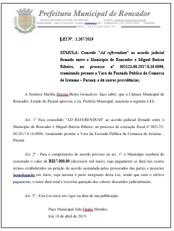 É a lei que autoriza a prefeitura roncadorense a firmar acordo com ele.