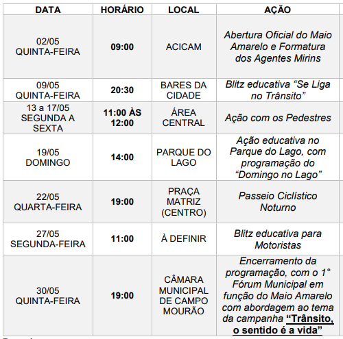 A formatura de 50 agentes mirins de trânsito (alunos do 5º ano nas escolas municipais Florestan Fernandes e Mário Quintana) marcou nesta quinta-feira a abertura do Maio Amarelo em Campo Mourão. Haverá várias ações até o fim do mês. A última delas, no dia 30, será o 1º Fórum Municipal "Trânsito, o Sentido é a Vida".