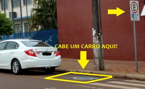 Apesar da placa e da sinalização horizontal informando que a vaga é para portadores de deficiência física, motoristas deixam um espaço muito pequeno, ou seja, invadem a vaga do portador de necessidades especiais. Isso acontece com frequência em Campo Mourão. Ou será que, pelo desenho feito no asfalto, acham que a vaga é para cadeira de rodas?