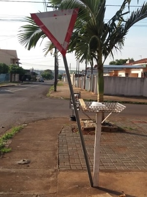 "Rua Souza Naves, esquina com a rua Jucelino Kubitschek, no jardim Albuquerque. Morador amarrou a placa de trânsito na lixeira".