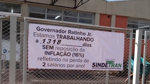Faixa colocada em frente à 8ª Ciretran de Campo Mourão, nesta segunda-feira, diz que os servidores estão há 1.318 dias se reajustes salarial. A inflação nesse período foi de 16%, ou seja, esse é perda salarial da categoria. O protesto silencioso também destaca que a falta de recomposição equivale a dois salários perdidos por ano.