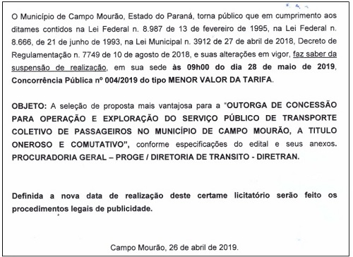 Está suspensa a licitação do transporte coletivo urbano de Campo Mourão.