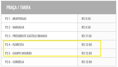 Nas praças de Campo Mourão e de Floresta a redução será de R$ 3 para veículos de passeio.