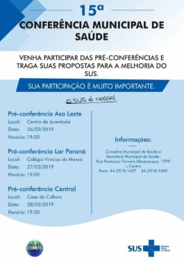 1) Acontece esta semana as três pré-conferências municipais de saúde de Campo Mourão. Nesta terça-feira é no Centro da Juventude. Na quarta será no colégio Vinicius de Moraes (Cohapar) e na quinta na Casa da Cultura. Sempre às 19h. A conferência será dia 14, no Sesc.