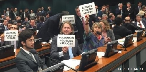O deputado federal Zeca Dirceu saiu em destaque em foto publicada neta terça-feira no portal UOL. Estava com o cartaz "Bolsonaro + Guedes = Fujões". Foi um protesto pelo fato do ministro da Economia, Paulo Guedes, não ter ido à Comissão de Constituição e Justiça falar sobe o projeto de reforma da Previdência.