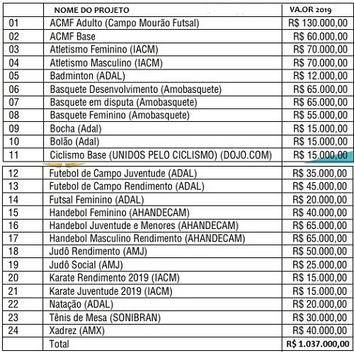 A Fundação de Esportes de Campo Mourão divulgou nesta terça-feira os 24 projetos aprovados para buscar a Lei de Incentivo ao Esporte. Vão de R$ 12 mil a R$ 130 mil, num total de R$ 1.037.000. A relação contempla 14 modalidades, do futebol ao badminton. A Fecam manteve fora os dois projetos que tinham gerado até denúncia no Ministério Público - Ciclismo Ari Mateus e Karate Social, da Dojo.com.