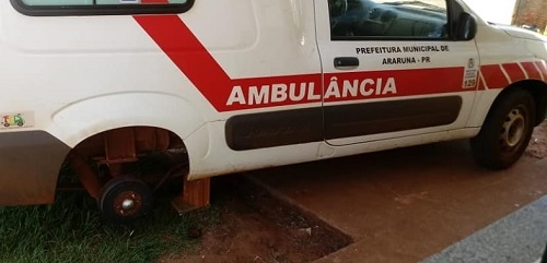 Faz 40 dias que o distrito de São Vicente, em Araruna, ganhou uma ambulância 0 km. Foi a primeira vez que a comundade ficou com um carro zerado para isso. Mas olha só o que aconteceu no fim de semana. Levaram um dos pneus da ambulância, com roda e tudo. Isso dentro do posto. Câmeras de segurança mostraram que foram dois ladrões.