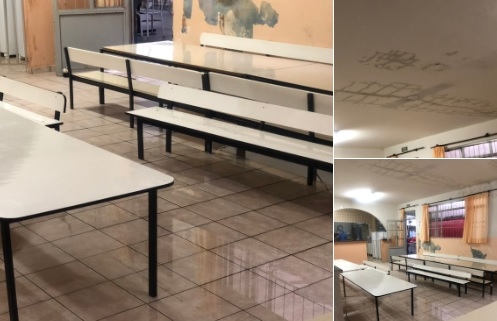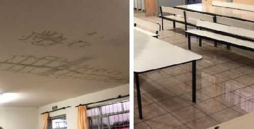"Esse é o cemei Sagrada Família, nesta terça-feira pela manhã. Houve alagamento do refeitório e de duas salas de aula. As aulas da creche foram canceladas e poucos alunos puderam ficar. A prefeitura já foi notificada sobre a infiltração na laje desde a chuva do dia 30. O cemei fica na Rua Brasil".