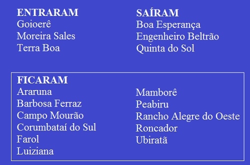 A Copa Comcam Sicredi 019 começa no dia 10 de março e, assim como ano passado, terá 14 cidades na disputa. Mas não são as mesmas 14, não. Goioerê, Moreira Sales e Terra Boa são as novidades. Em compensação, saíram Boa Esperança, Engenheiro Beltrão e Quinta do Sol.