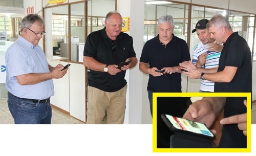 Vereador Edson Battilani, agropecuarista Cézar Bronzel, deputado Douglas Fabrício e vereadores Tucano e Edilson Martins. Todos de olho em seus celulares. A foto menor, com close nas mãos de Douglas, não deixa dúvidas: todos ligados na Boca Santa.
